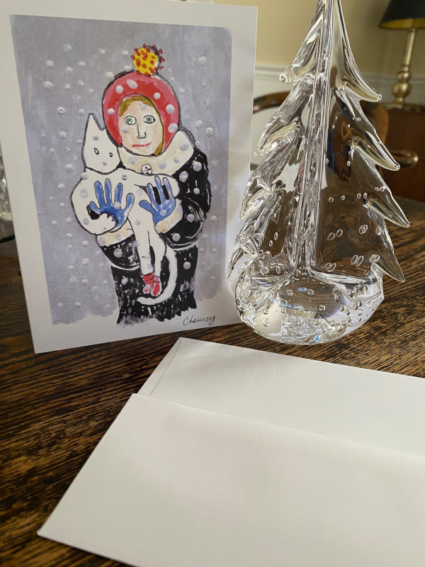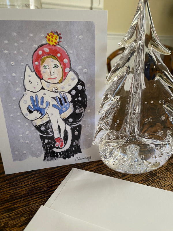 Who says snow days aren't stylish? This delightfully whimsical card features a bundled-up girl sharing a blustery January outing with her feline friend - who is, of course, wearing tiny red snow boots! Against a swirl of winter white, this charming illustration captures the magic of a snowy day. Perfect for sending a cheerful lift to fellow cat lovers and winter enthusiasts!
